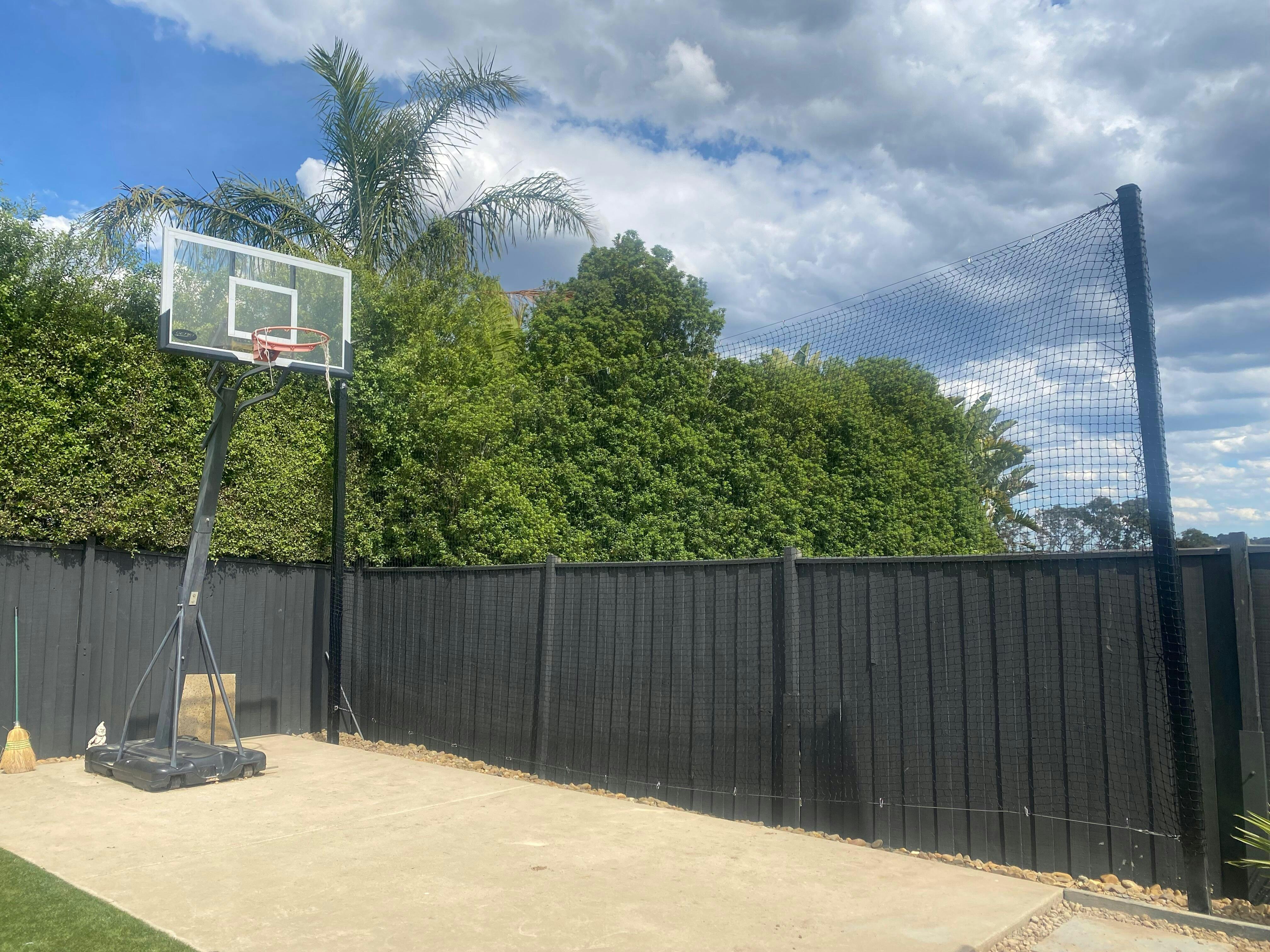 Purchased a 5 m x 3 m ball stop net with two fence mount support posts.
